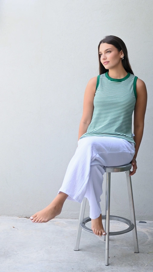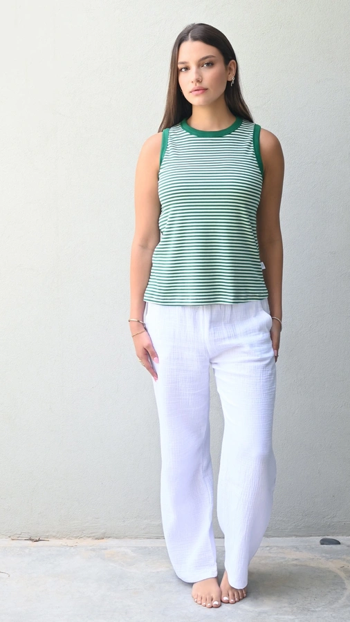 הדוגמנית לובשת מידה 1 בשילוב מכנסי טטרה לבן דגם שושי מידה 1.