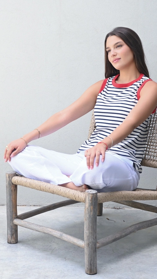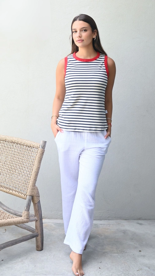 הדוגמנית לובשת מידה 1 בשילוב מכנסי טטרה לבן שושי מידה 1.