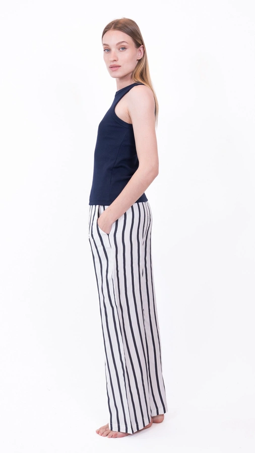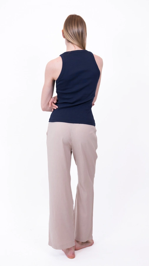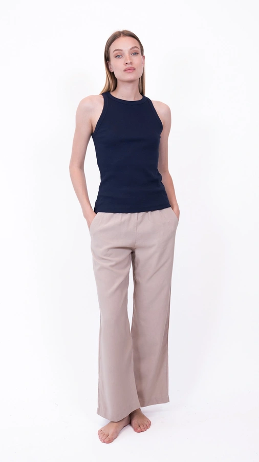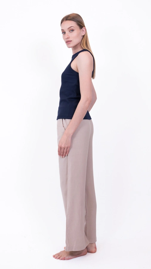 הדוגמנית לובשת מידה 1, בשילוב מכנסי שושי ויסקוזה צבע חול מידה 1.